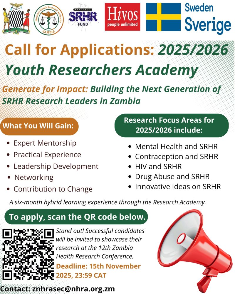 Apply now for the Youth Researchers Academy 2025/2026 by the National Health Research Authority (NHRA), a fully funded six-month hybrid program aimed at building the next generation of SRHR research leaders in Zambia. Deadline: 15 November 2025.