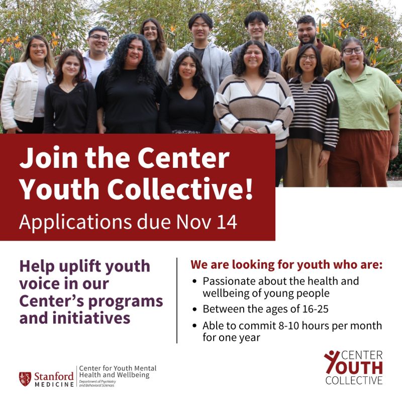 Applications are now open for the Stanford Center Youth Collective 2025, inviting young people ages 16–25 to join the Center for Youth Mental Health and Wellbeing as youth leaders and advisors. Deadline: November 14, 2025.